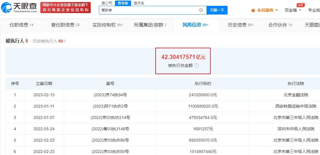 值得关注的是,据天眼查不完全统计,目前贾跃亭被执行总金额已超42亿元,相关案号分别为(2023)京74执94号、(2023)陕71执恢2号、(2023)京03执恢214号、(2023)粤03执3148号、(2023)京03执恢86号、(2023)京03执恢85号。此外,贾跃亭已经关联多条被执行人、失信被执行人、限制消费等。