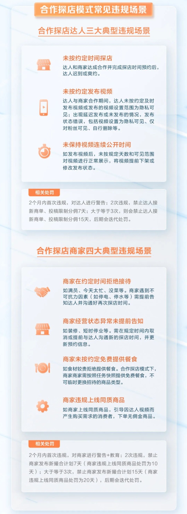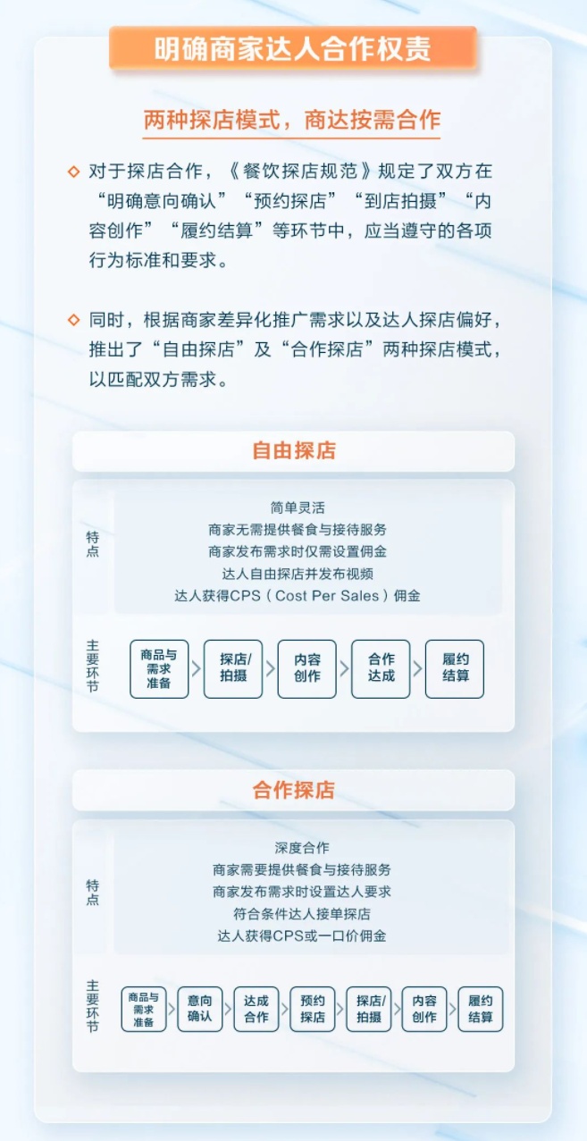 对于探店合作,《餐饮探店规范》规定了双方在“明确意向确认”“预约探店”“到店拍摄”“内容创作”“履约结算”等环节中,应当遵守的各项行为标准和要求。同时,根据商家差异化推广需求以及达人探店偏好,推出了“自由探店”及“合作探店”两种探店模式,以匹配双方需求。