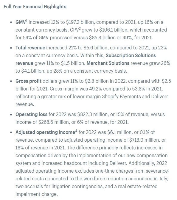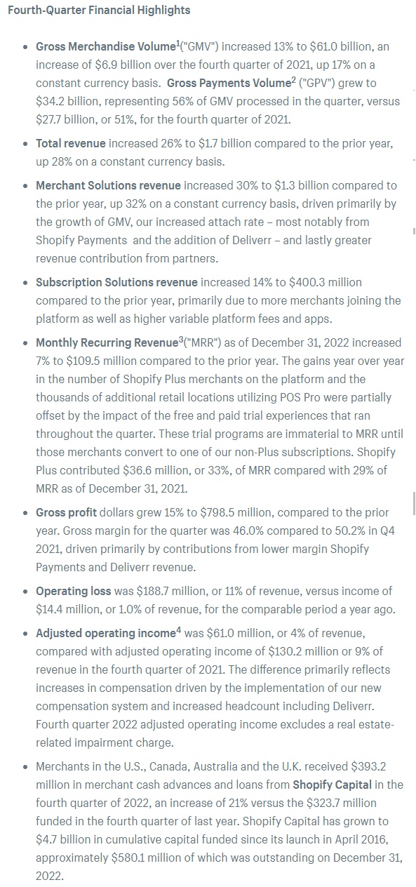 Shopify 2022年第四季度及全年财报 来源:Shopify新闻中心,下同