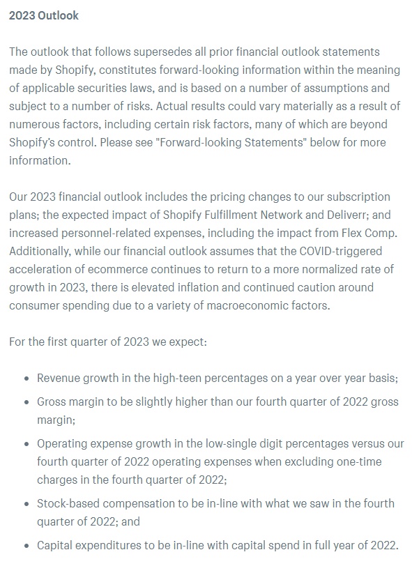 对于2023年第一季度,Shopify预计:营收同比增长10%以上;毛利率将略高于2022年第四季度的毛利率;与2022年第四季度的运营费用相比,不包括2022年第四季度的一次性费用,运营费用的低个位数百分比增长;资本支出与2022年全年的资本支出保持一致。