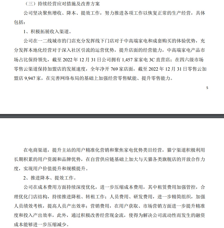 公告表示,2023年公司将进一步聚焦供应链和零售运营能力提升,结合各渠道的核心优势,深化降本提效的配套举措机制,扩大品牌供应商合作的广度和深度,从恢复走向发展,实现销售规模正向增长、冲击盈利能力拐点实现,从而提升公司的持续经营能力。