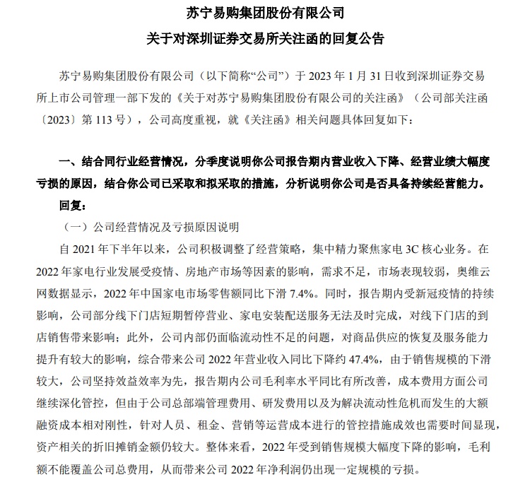 2月16日消息,苏宁易购日前发布公告回复深交所关注函。针对苏宁易购1月31日发布的2022年度业绩预告,深交所当日向其发送关注函。此前,苏宁易购已两次延期回复此关注函。