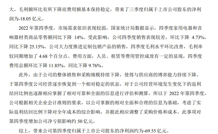 此外,由于公司的整体销售和采购规模持续下降,使得与供应商的博弈能力持续下降,于第四季度公司经营逐步恢复到一个相对稳定的状态,对于公司经营环境发生变化下的返利结回比例也逐渐相应掌握了相对可靠和全面的信息进行评估和测算,所以于2022年第四季度,公司根据相关企业会计准则的要求,以公司掌握的相对全面和合理的信息为基础,考虑了实际返利结回比例下降对全年成本的综合影响,并据此相应调整了采购价格和成本。此事项对第四季度增加公司净亏损影响约50亿元。