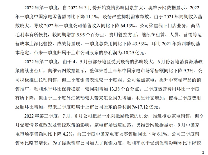 公告分季度说明了公司报告期内营业收入下降、经营业绩大幅度亏损的原因。其中,2022年第四季度,市场需求依旧表现较弱,受此影响,公司四季度销售表现较差,环比下降4.73%,同比下降25.15%。公司大力度推进定制包销产品的销售,四季度毛利水平环比改善,毛利率较同期增加了4.68个百分点。费用方面,人员、租赁等费用管控成效有一定的显现,四季度费用总额环比下降11.85%、同比下降9.76%。