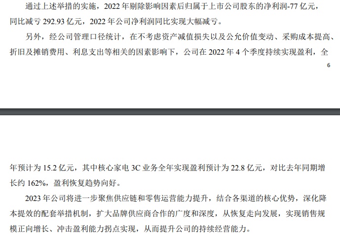 另外,经公司管理口径统计,在不考虑资产减值损失以及公允价值变动、采购成本提高、折旧及摊销费用、利息支出等相关的因素影响下,公司在2022年4个季度持续实现盈利,全年预计为15.2亿元,其中核心家电3C业务全年实现盈利预计为22.8亿元,对比去年同期增长约162%,盈利恢复趋势向好。