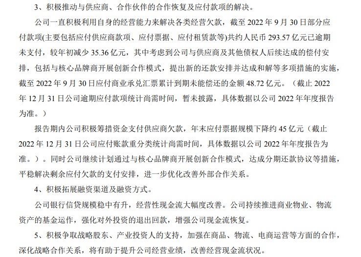 积极推动与供应商、合作伙伴的合作恢复及应付款项的解决。截至2022年9月30日部分应付款项(主要包括应付供应商款项、应付票据、应付租赁款等)共约人民币293.57亿元已逾期未支付,较年初减少35.36亿元,其中考虑到公司与供应商及其他债权人后续达成的偿付安排,包括与核心品牌商开展创新合作模式,提出新的还款安排并达成和解等多项措施的实施,截至2022年9月30日应付商业承兑汇票累计到期未能偿还的金额48.72亿元。(截止2022年12月31日公司逾期应付款项统计尚需时间,暂未披露,具体数据以公司2022年年度报告为准。)