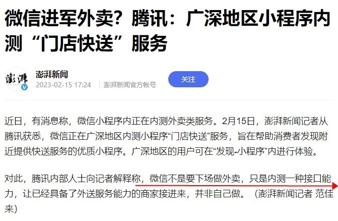 针对“微信将进军外卖”的消息,腾讯内部人士回应,微信不是要下场做外卖,只是内测一种接口能力,让已经具备了外送服务能力的商家接进来,并非自己做。