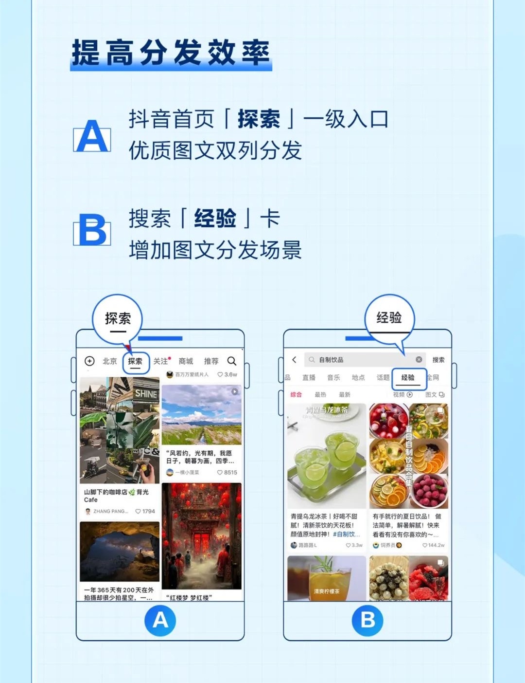 在产品功能方面,抖音正在针对部分图文兴趣用户内测首页“探索”一级流量入口和搜索“经验”卡,增加图文双列分发,并开放搜索功能,同时上线了多款优化图文创作体验的工具。
