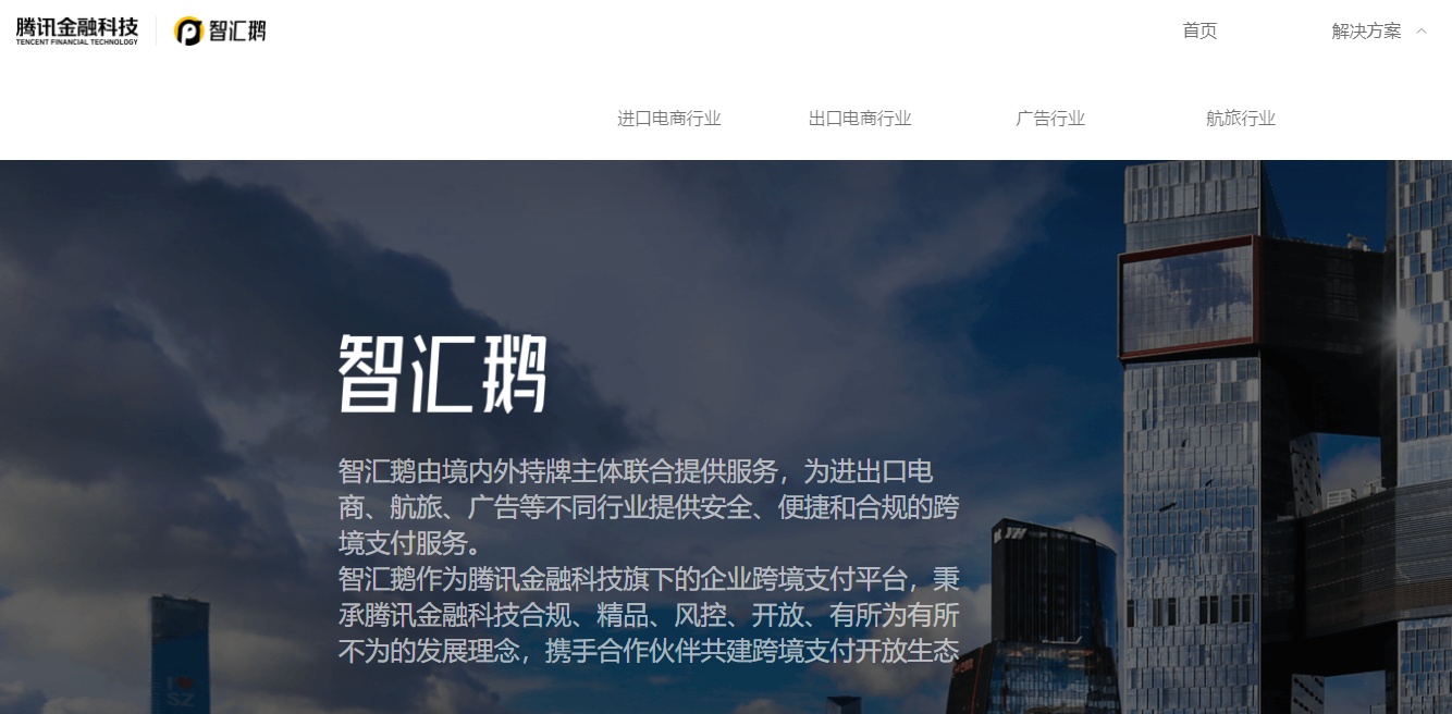 据官网资料介绍,智汇鹅由境内外持牌主体联合提供服务,为进出口电商、航旅、广告等不同行业提供安全、便捷和合规的跨境支付服务。智汇鹅作为腾讯金融科技旗下的企业跨境支付平台,秉承腾讯金融科技合规、精品、风控、开放、有所为有所不为的发展理念,携手合作伙伴共建跨境支付开放生态。