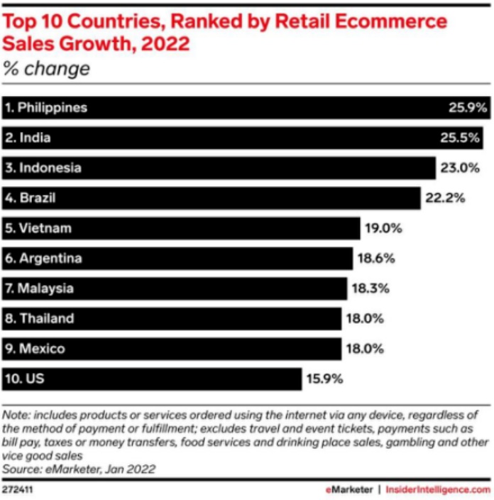 据eMarketer全球电子商务2022年预测数据显示,全球电子商务市场销售额增长排行榜单中拉美占了三个席位,其中就有巴西,其电商增速有望达到了22.2%。