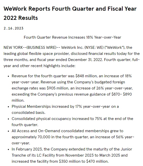 2月17日消息,WeWork日前公布了截至2022年12月31日的三个月和全年的财务业绩。