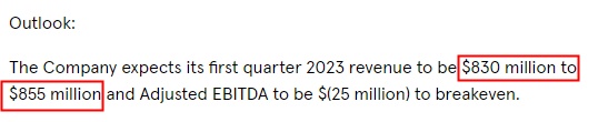 公司预计其2023年第一季度的收入为8.3亿美元至8.55亿美元,调整后的EBITDA为负2500万美元至收支平衡。