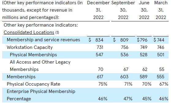 2022年第四季度,WeWork实体会员同比增长了17%,实体入住率提高到75%,All Access和On-Demand会员人数增长至约70000人,同比增长56%。去年第四季度,每实体会员平均收入(ARPM)为481美元。
