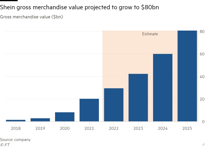 SHEIN预计,到2025年,平台上的商品交易总额(GMV)将增长至806亿美元,较去年增长174%。