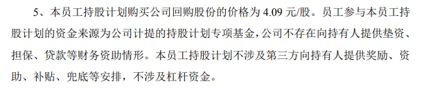 本员工持股计划购买公司回购股份的价格为4.09元/股。员工参与本员工持股计划的资金来源为公司计提的持股计划专项基金,公司不存在向持有人提供垫资、担保、贷款等财务资助情形,也不涉及第三方向持有人提供奖励、资助、补贴、兜底等安排,不涉及杠杆资金。