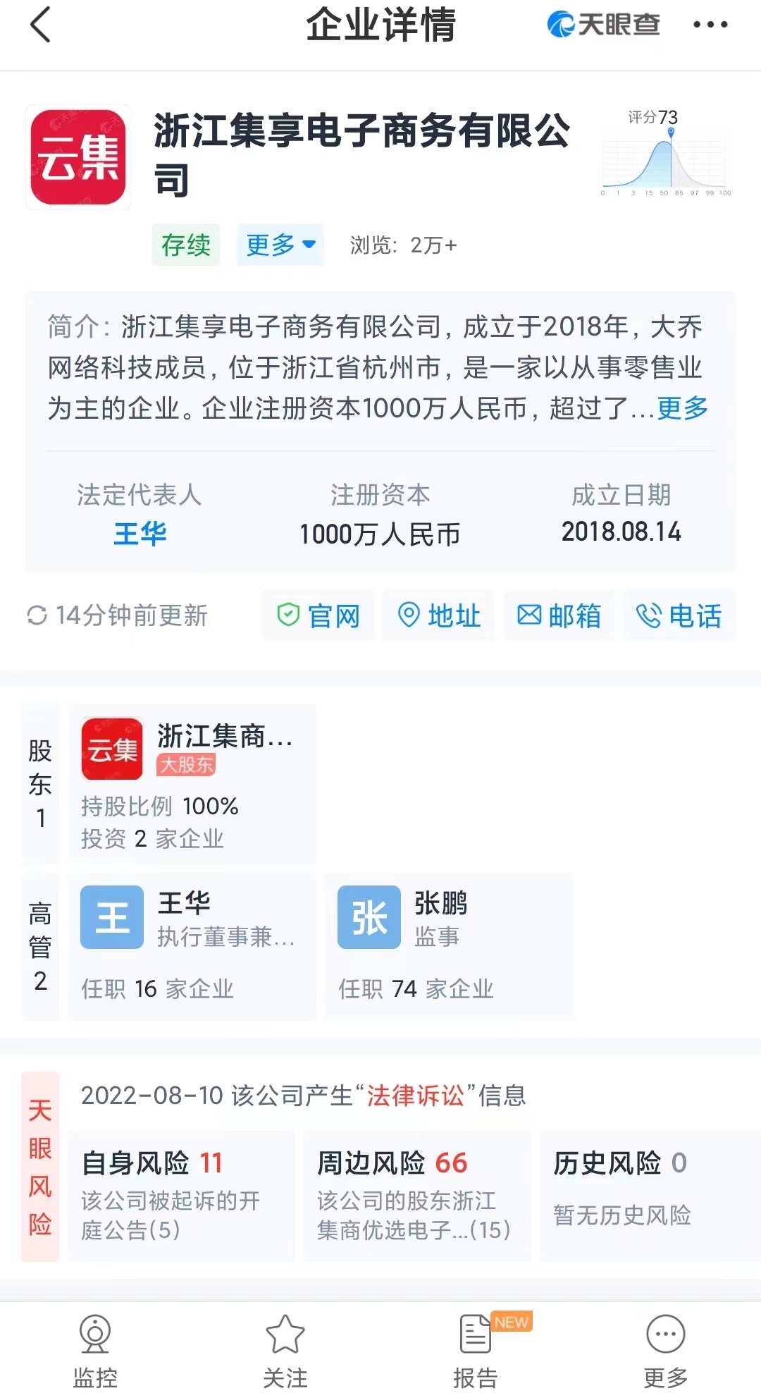 天眼查App显示,浙江集享电子商务有限公司成立于2018年,法定代表人为王华,企业注册资本1000万人民币,企业经营范围包括互联网销售(除销售需要许可的商品);化妆品批发;化妆品零售;服装服饰批发;服装服饰零售;鞋帽批发;鞋帽零售;箱包销售;家居用品销售;日用百货销售;日用品批发等。