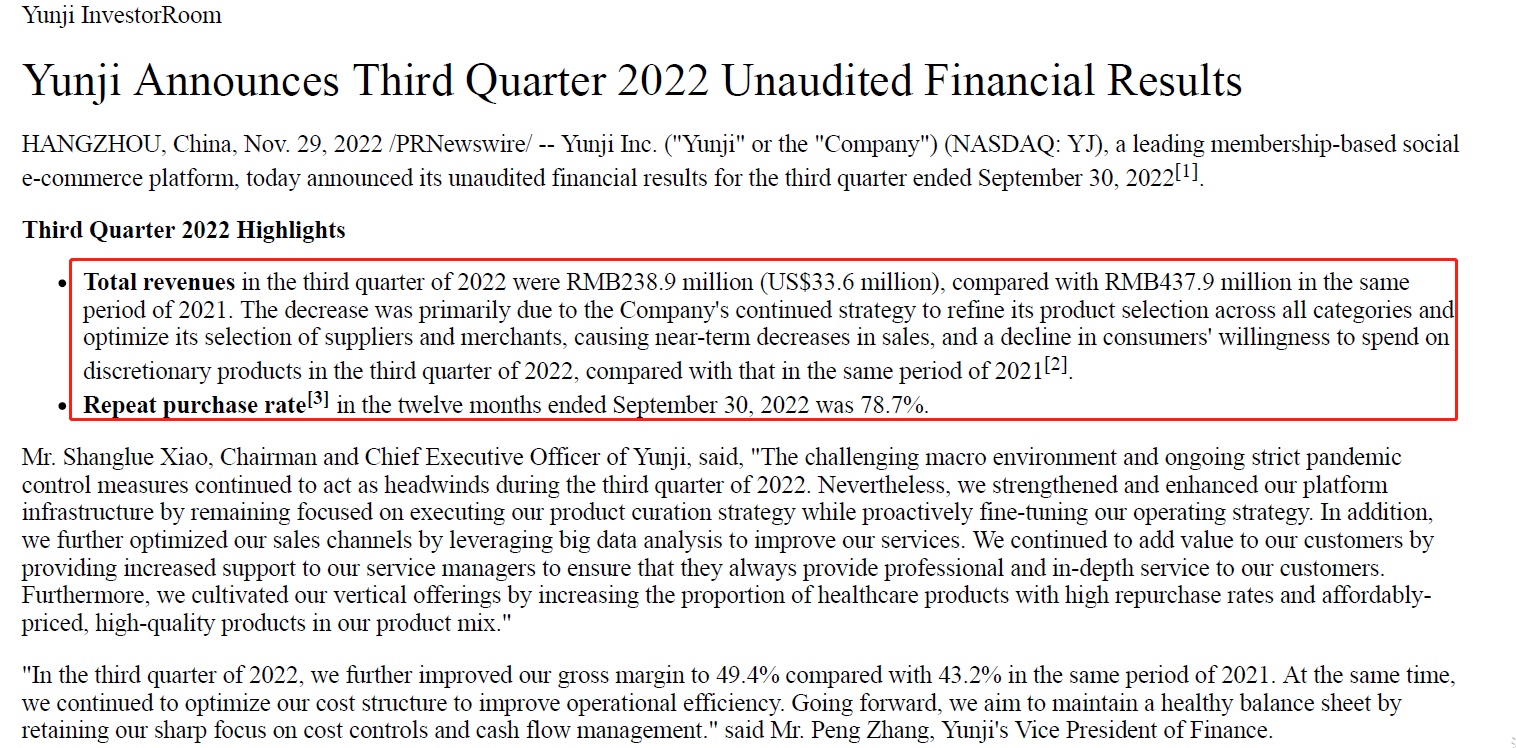 云集2022年Q3财报显示,2022年第三季度云集实现总营收2.389亿元。与2021年同期相比,毛利率从43.2%提高到49.4%。截止2022年9月30日,云集过去12个月的复购率为78.7%。2022年Q3云集总运营费用为人民币1.385亿元,同比下降28.5%。