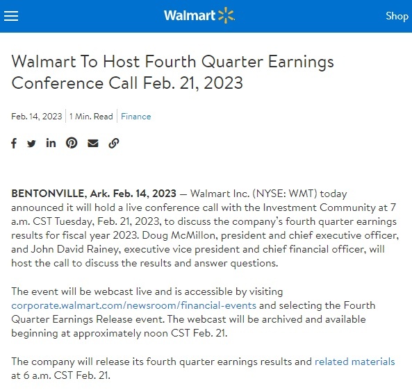值得一提的是,沃尔玛近日宣布,将于CST时间2023年2月21日周二上午7点与投资界举行现场电话会议,讨论该公司2023财年第四季度的收益结果。公司总裁兼首席执行官Doug McMillon和执行副总裁兼首席财务长John David Rainey将主持电话会议,讨论业绩并回答问题。该活动将进行网络直播,网络直播将于2月21日中午左右开始存档。