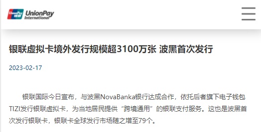 2月17日消息,银联国际今日宣布,与波黑NovaBanka银行达成合作,依托后者旗下电子钱包TIZI发行银联虚拟卡,为当地居民提供“跨境通用”的银联支付服务。这也是波黑首次发行银联卡,银联卡全球发行市场随之增至79个。