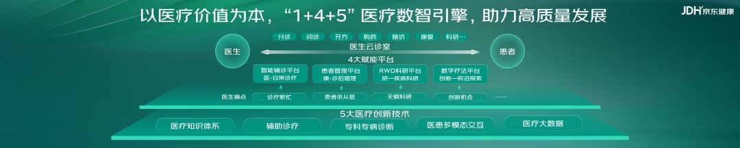 李欣表示,“1+4+5”医疗数智引擎融汇了京东健康近年来在互联网诊疗技术层面的一系列探索和突破。其中,1是指1个线上云诊室,4是指四大技术平台,分别为智能辅诊平台、诊后管理平台、RWD科研平台和数字疗法平台,5是指五大医疗创新技术,包括医疗知识体系、辅助诊疗、专科诊断、医患多模态交互和医疗大数据。