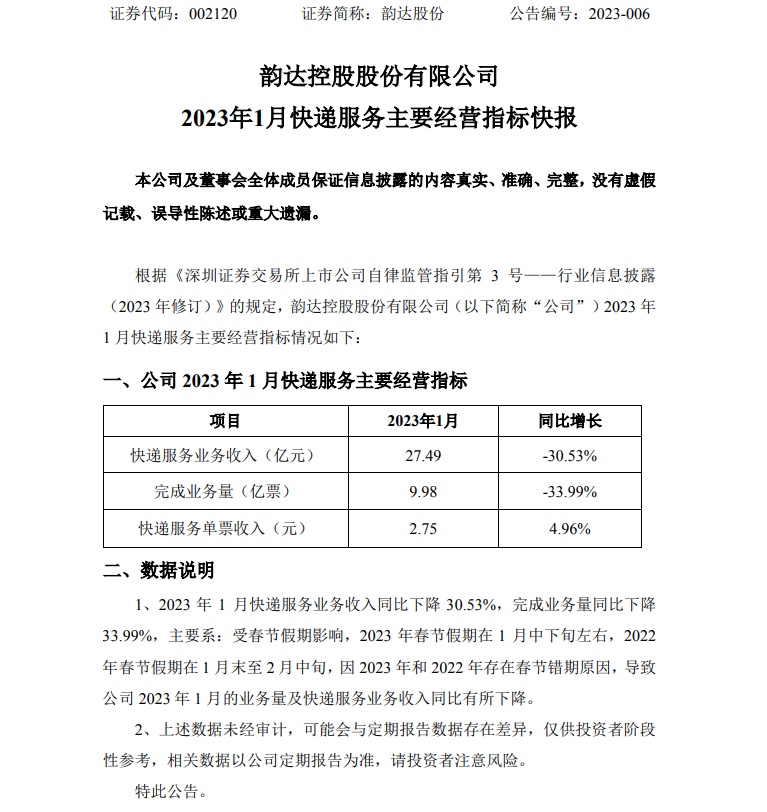 韵达1月快递服务业务收入27.49亿元 同比下降30.53%