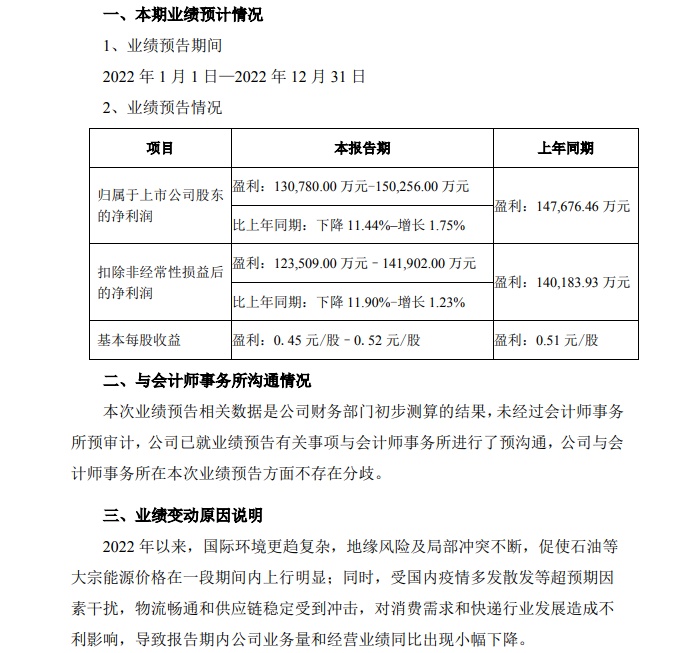 1月30日,韵达发布2022年度业绩预告,预计2022年净利润13.08亿元-15.03亿元,比2021年下降11.44%–增长1.75%,预计扣除非经常性损益后的净利润为123,509.00万元–141,902.00万元,比2021年下降11.90%-增长1.23%。