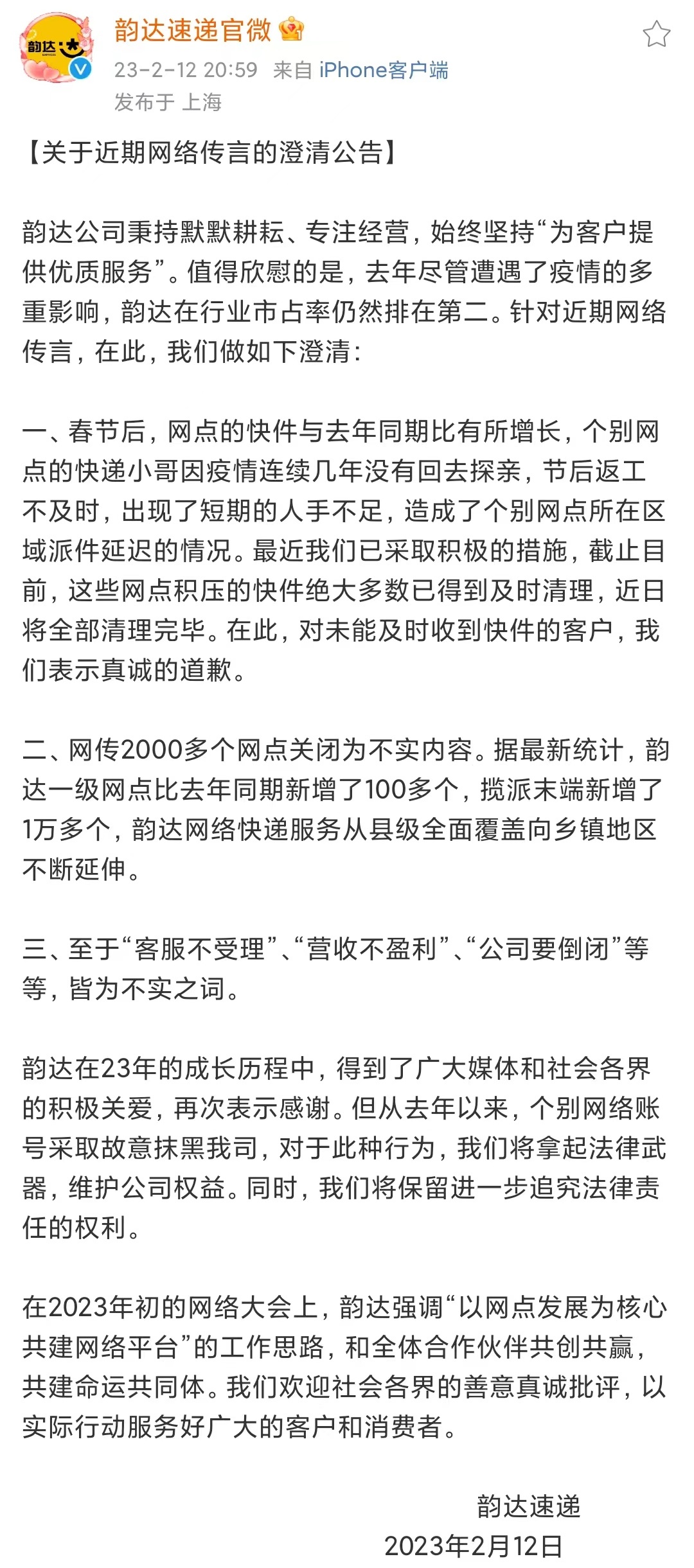 值得关注的是,近期网传韵达2000多个网点关闭、公司要倒闭。针对此传言,韵达速递官微2月12日发布公告回应称,春节后,网点的快件与去年同期比有所增长,个别网点的快递小哥因疫情连续几年没有回去探亲,节后返工不及时,出现了短期的人手不足,造成了个别网点所在区域派件延迟的情况。