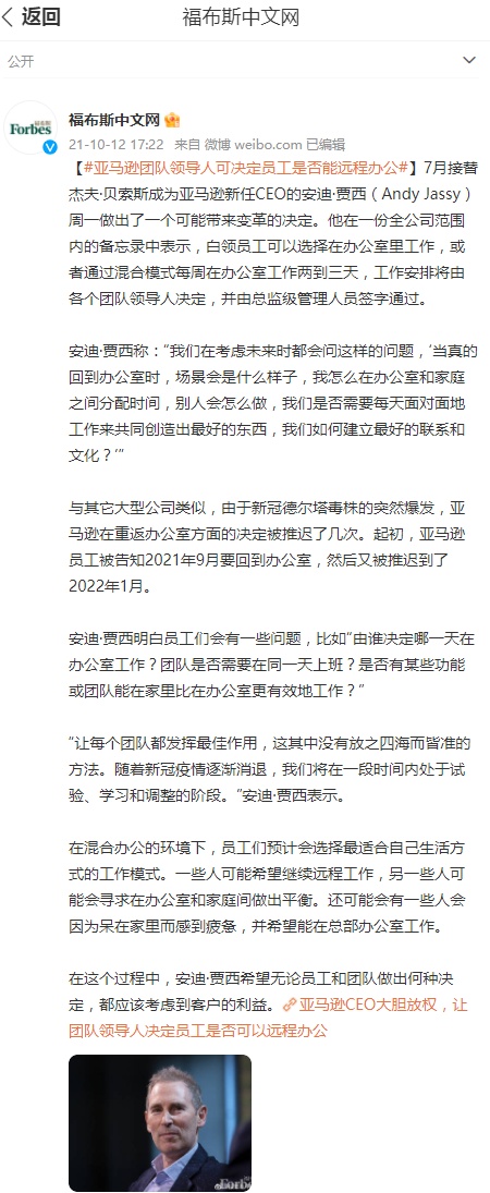 据了解,2021年7月接替杰夫·贝索斯成为亚马逊新任CEO的安迪·贾西(Andy Jassy)在当年10月做出了一个可能带来变革的决定。他在一份全公司范围内的备忘录中表示,白领员工可以选择在办公室里工作,或者通过混合模式每周在办公室工作两到三天,工作安排将由各个团队领导人决定,并由总监级管理人员签字通过。