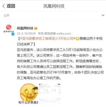 据悉,新冠疫情爆发后,各大科技公司普遍让员工回家远程工作。随着新冠封锁措施的调整,亚马逊曾在2021年10月宣布,由各个团队决定公司员工每周在办公室工作的天数。
