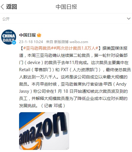 今年1月,亚马逊首席执行官安迪·贾西称公司会在1月18日开始通知被此次裁员波及到的员工,并解释大规模裁员是为了降低企业成本以应对长期的发展挑战。