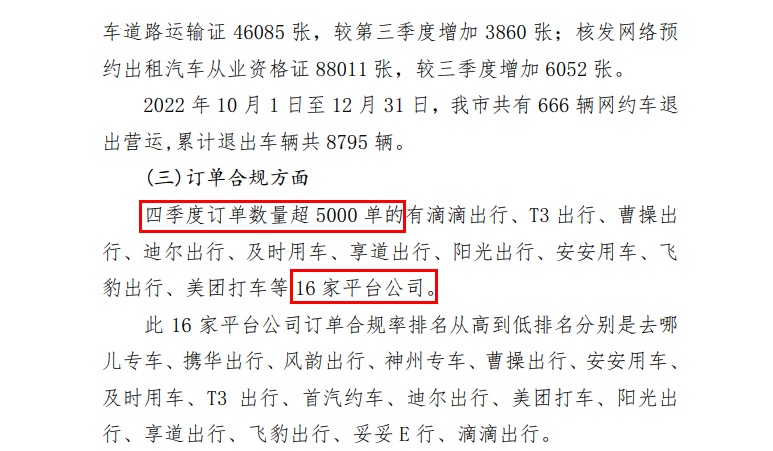 青岛市2022年第四季共16家网约车平台公司订单量超5000单