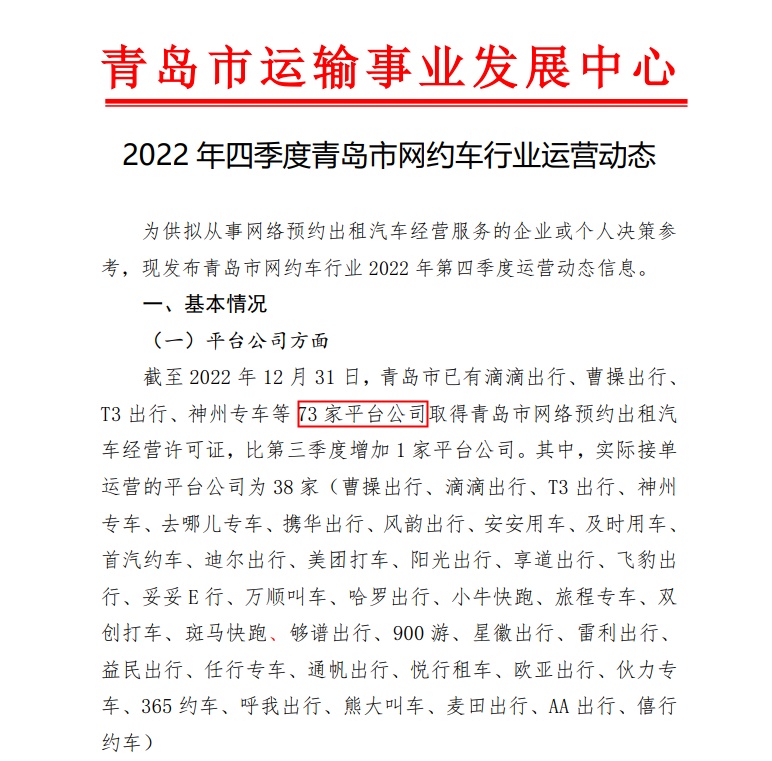 截至2022年12月31日,青岛市已有滴滴出行、曹操出行、T3出行、神州专车等73家平台公司取得青岛市网络预约出租汽车经营许可证,比第三季度增加1家平台公司。其中,实际接单运营的平台公司为38家(曹操出行、滴滴出行、T3出行、神州专车、去哪儿专车、携华出行、风韵出行、安安用车、及时用车、首汽约车、迪尔出行、美团打车、阳光出行、享道出行、飞豹出行、妥妥E行、万顺叫车、哈罗出行、小牛快跑、旅程专车、双创打车、斑马快跑、够谱出行、900游、星徽出行、雷利出行、益民出行、任行专车、通帆出行、悦行租车、欧亚出行、伙力专车、365约车、呼我出行、熊大叫车、麦田出行、AA出行、僖行约车)。