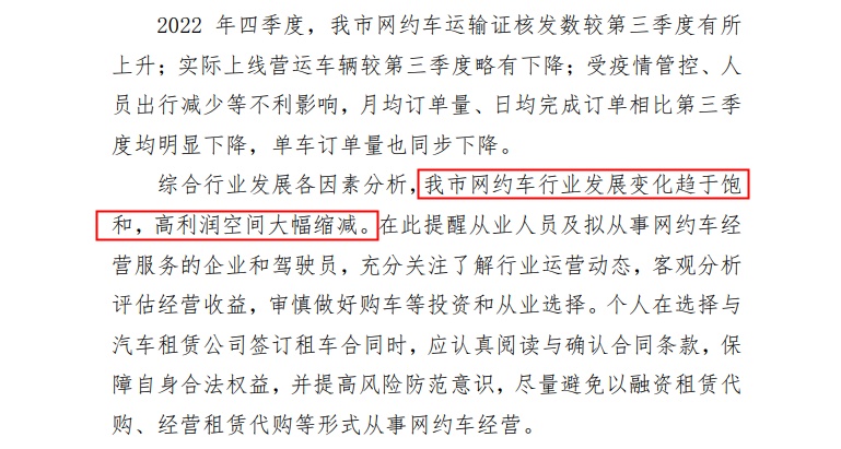 综合行业发展各因素分析,青岛市网约车行业发展变化趋于饱和,高利润空间大幅缩减。在此提醒从业人员及拟从事网约车经营服务的企业和驾驶员,充分关注了解行业运营动态,客观分析评估经营收益,审慎做好购车等投资和从业选择。个人在选择与汽车租赁公司签订租车合同时,应认真阅读与确认合同条款,保障自身合法权益,并提高风险防范意识,尽量避免以融资租赁代购、经营租赁代购等形式从事网约车经营。