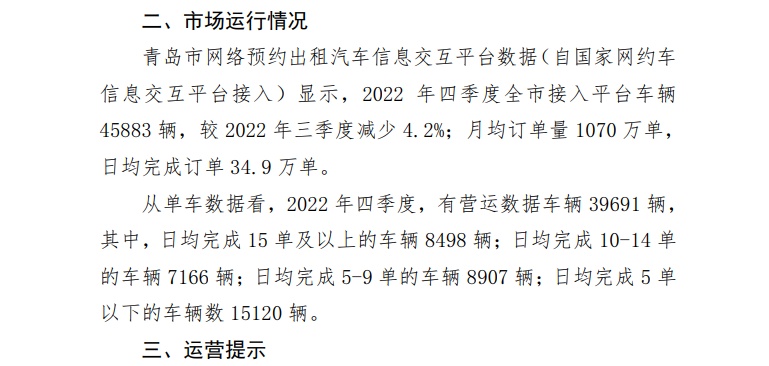 2月17日消息,为供拟从事网络预约出租汽车经营服务的企业或个人决策参考,青岛市运输事业发展中心近期发布青岛市网约车行业2022年第四季度运营动态信息。
