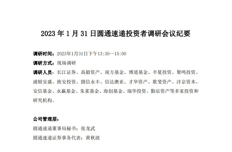 值得一提的是,近期,圆通速递发布投资者调研会议纪要。调研人员为长江证券、高毅资产、南方基金、博道基金、半夏投资、聚鸣投资、 浦银安盛、旌安投资、圆信永丰、信达澳亚、才华资产等多家投资和研究机构。