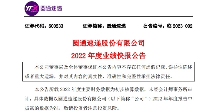 另外,圆通速递上个月公布了2022年度业绩快报公告,公告显示,2022年,圆通速递实现营业总收入535.46亿元,同比增长18.58%;营业利润50.85亿元,同比增长78.33%;利润总额50.47亿元,同比增长82.41%。