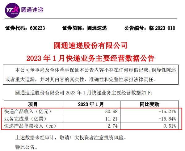 2月17日消息,圆通速递股份有限公司(以下简称“圆通速递”)发布2023年1月快递业务主要经营数据公告。