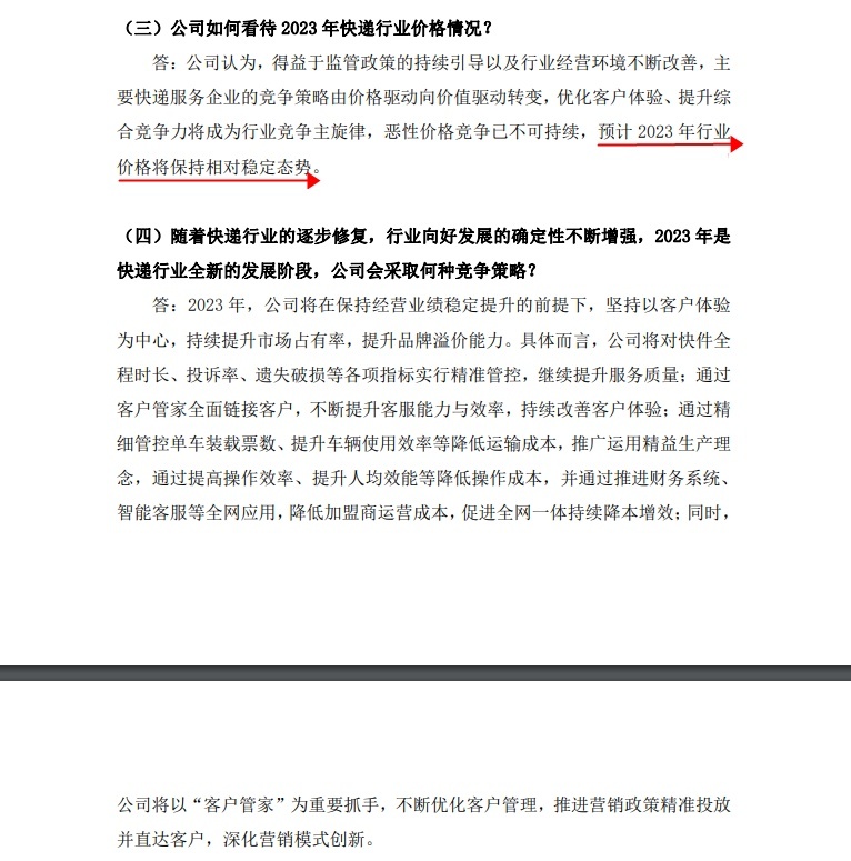 谈及2023年公司会采取何种竞争策略,圆通方面表示,2023年公司将在保持经营业绩稳定提升的前提下,坚持以客户体验为中心,持续提升市场占有率,提升品牌溢价能力。