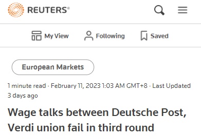 据悉,德国邮政和工会上一次达成集体薪资协议是在2020年9月,该协议期限为28个月。协议规定,员工的工资从2021年1月1日起增加3%,到2022年1月1日再增加2%。自去年12月起,德国邮政员工就开始不断提出涨薪要求,1月份的谈判失败后,更是有数万名员工参与了为期三天的罢工。