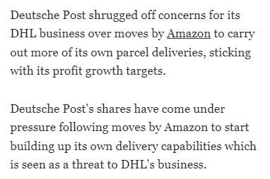 此外,亚马逊的影响力越来越大,自从其在德国开始建立自己的在线包裹配送网络,减少了对大型物流运营商的依赖,德国邮政能够获得的包裹递送量就在逐渐下降,而在整个欧洲,亚马逊已经成为第六大运输公司,物流营业额达40亿欧元。