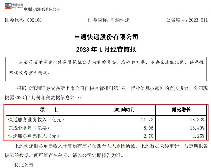 2月17日消息,申通快递股份有限公司(以下简称“申通快递”)发布2023年1月经营简报。公告显示,申通快递2023年1月快递服务业务收入达21.72亿元,同比下降15.33%;完成业务量8.06亿票,同比下降18.49%;快递服务单票收入2.7元,同比增长4.25%。