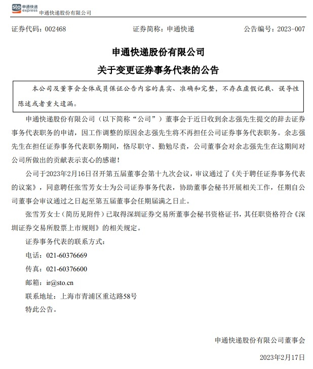 值得一提的是,申通快递股份有限公司(以下简称申通快递或公司)今日发布关于变更证券事务代表的公告(以下简称公告)。
