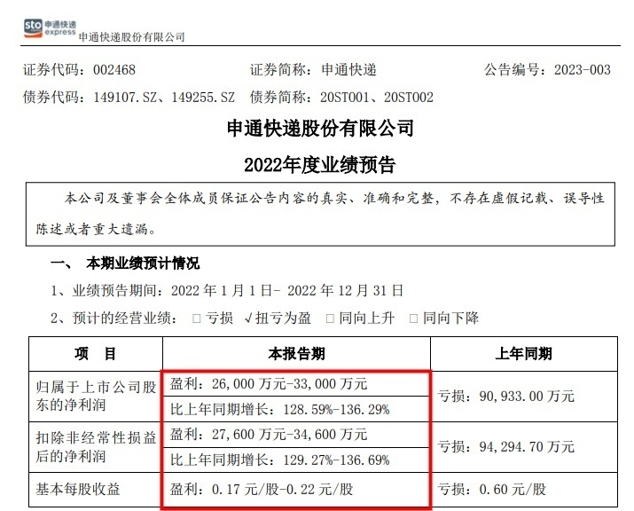 根据申通此前公布的2022年业绩预告,该公司预计2022年实现扣除非经常性损益后的净利润区间为2.76亿至3.46亿元,同比增长129.27%-136.69%;其中第四季度,公司预计实现扣除非经常性损益后的净利润区间为1.22亿元至1.92亿元,经营业绩同比显著改善。