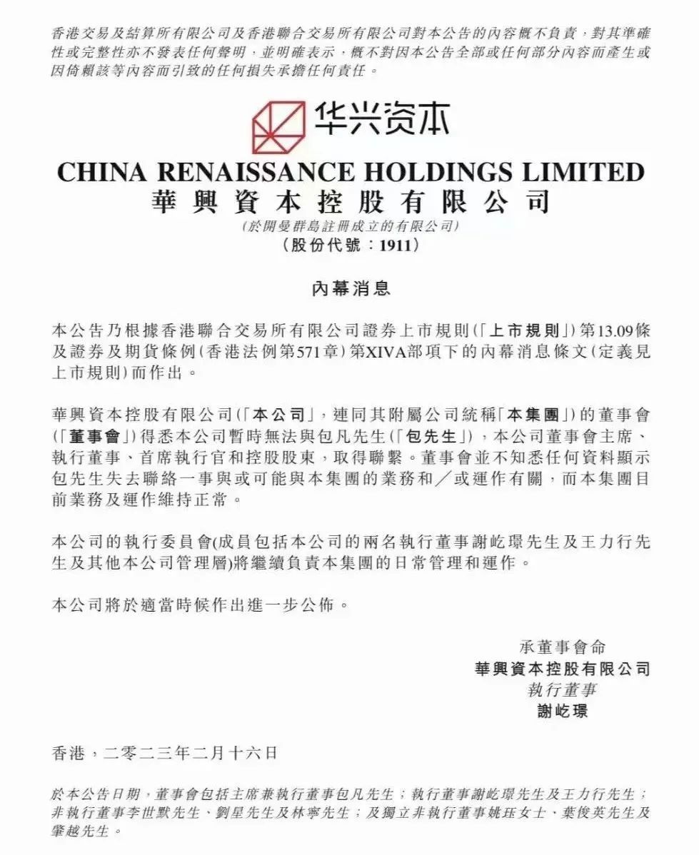 “公司暂时无法与包凡(公司董事会主席、执行董事、首席执行官和控股股东)取得联系。董事会并不知悉任何资料显示包先生失去联络一事与或可能与集团的业务和/或运作有关。”