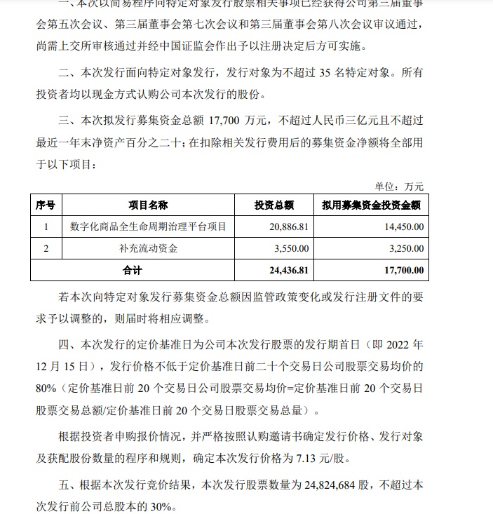 1月18日,光云科技发布2022年度以简易程序向特定对象发行股票预案(修订稿)。本次拟发行募集资金总额17700万元,不超过人民币三亿元且不超过最近一年末净资产百分之二十;在扣除相关发行费用后的募集资金净额将全部用于数字化商品全生命周期治理平台项目、补充流动资金。