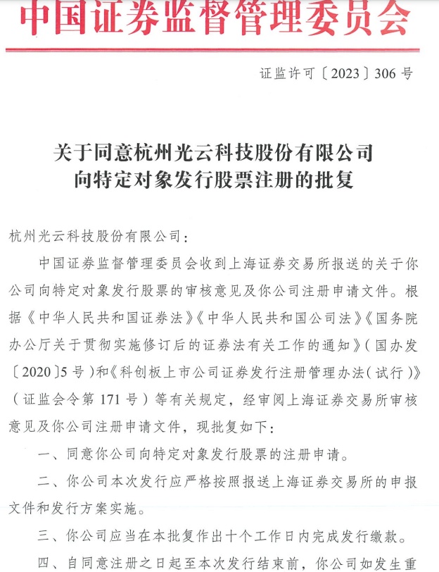 2月17日消息,光云科技获中国证券监督管理委员会批复同意向特定对象发行股票。中国证券监督管理委员会回复称,经审阅上海证券交易所审核意见及光云科技注册申请文件,现同意光云科技向特定对象发行股票的注册申请。