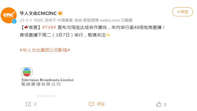3月2日消息,TVB日前宣布,其附属公司上海翡翠东方传播有限公司(TVBC)与淘宝达成合作意向,双方将于年内共同合作超过48场电商直播。公司表示,此合作预计为TVB带来港元千万级别的收益。