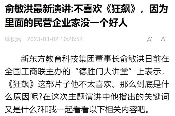 3月2日消息,新东方教育科技集团董事长俞敏洪日前在全国工商联主办的“德胜门大讲堂”上发表演讲。在演讲中,俞敏洪发表了他对《狂飙》的看法。