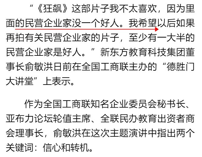 俞敏洪表示,他不太喜欢《狂飙》这部片子,“因为里面的民营企业家没一个好人。我希望以后如果再拍有关民营企业家的片子,至少有一大半的民营企业家是好人。”