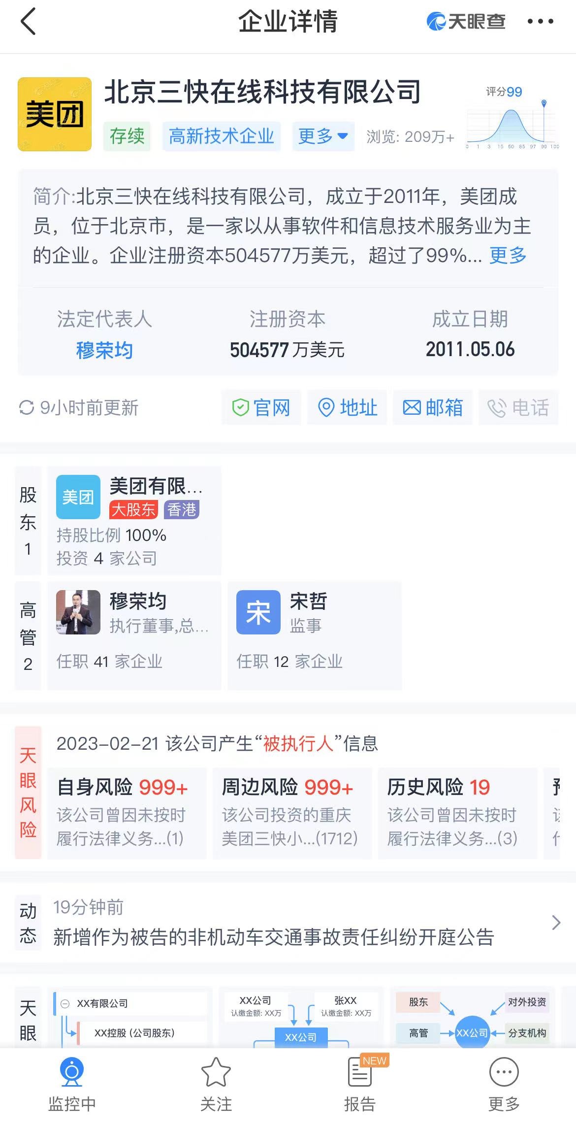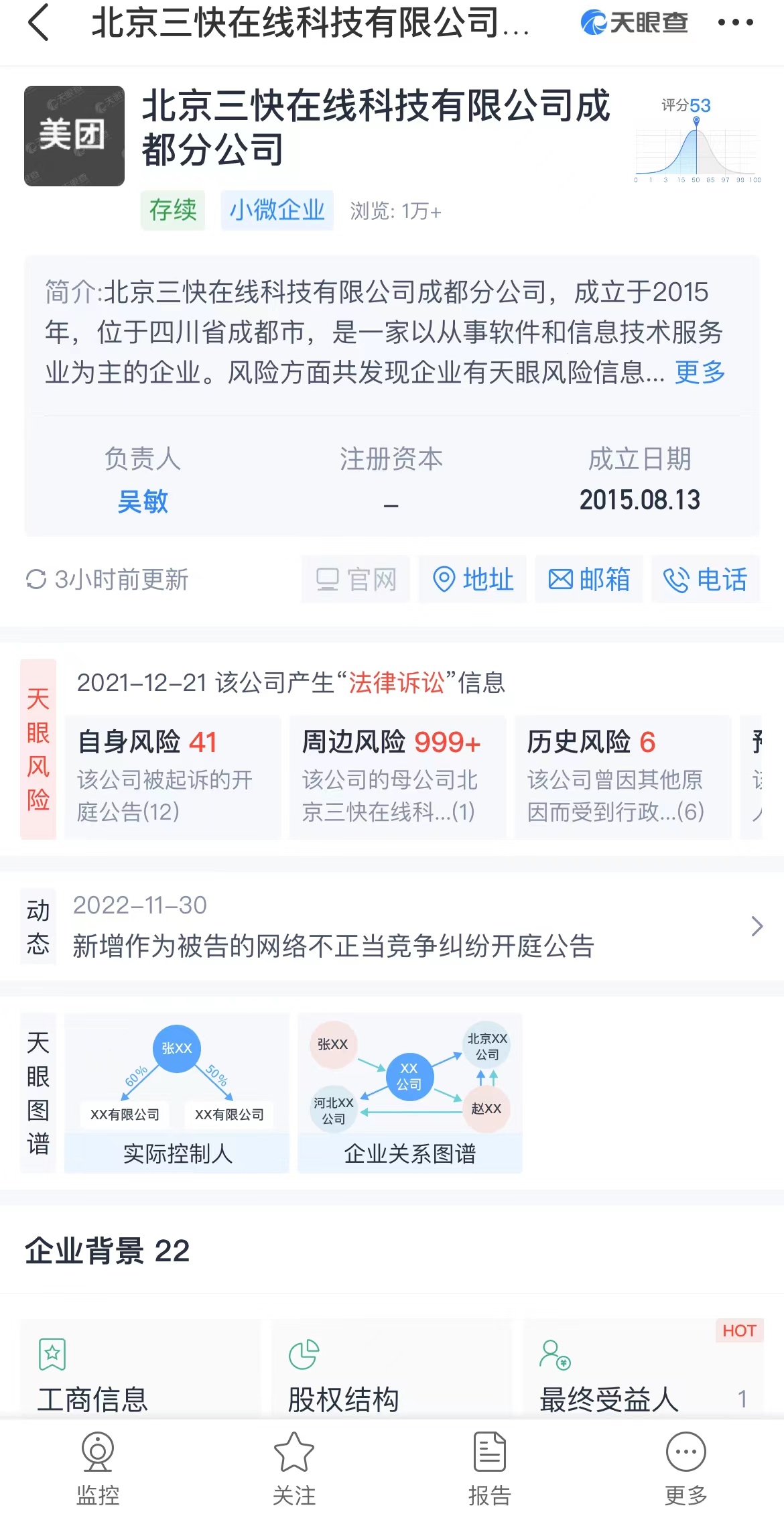 风险方面共发现企业有天眼风险信息2467条;还发现企业有法律诉讼6条,涉案总金额20.572166万元;涉诉关系21条,开庭公告13条,立案信息15条。
